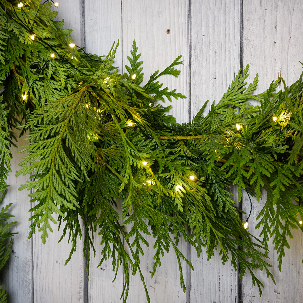 Light up your fresh garland this holiday season with our sensational Deluxe LED Garland Lights. Sometimes called firecracker string lights, they are similar in appearance to a strand of firecrackers. These stunning LED garland lights are warm white in color. The strand is 21 ft long and designed to perfectly fit an 18 ft section of garland. An amazing 504 lights are set along 21 ft of green wire to create a stunning effect that is bright and super festive. These electric lights plug in to power. Up to three sets can be connected together. They are easy to use - simply wrap them around or tuck them into the greenery. Suited for both indoor or outdoor use. Lights are shipped in a box and are not pre-installed on our products. These photos show how beautiful these LED lights look on our fresh cedar garland; the garland is not included. These lights are electric and plug in to power.