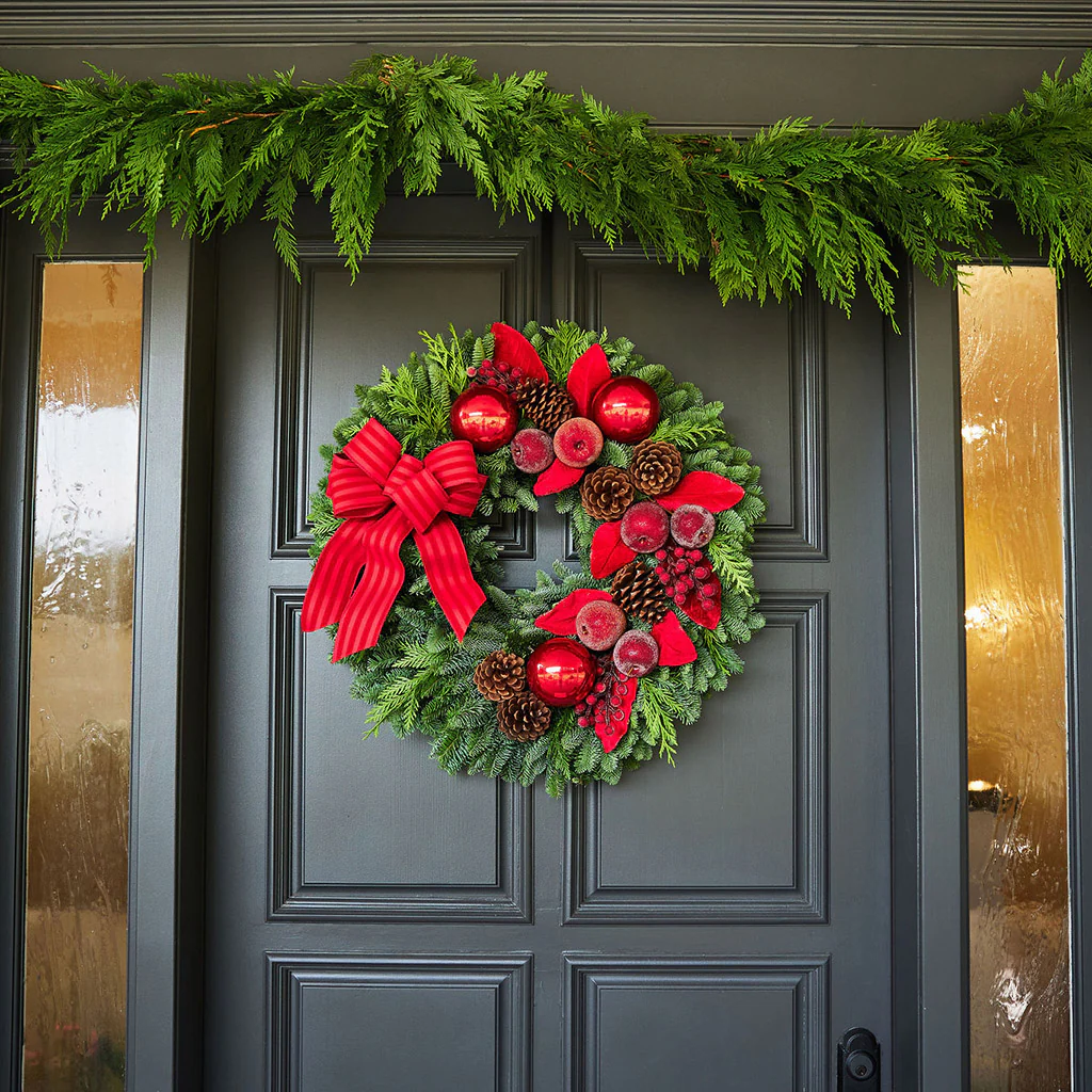 Revel in the splendor of the season with our Royal Harvest wreath, a regal statement piece that represents the rich red grandeur of the classic holiday! A lush bed of fresh noble fir and cedar is artfully decorated with frosted faux apples and berries, evoking the beauty of a festive banquet. Red glossy ball ornaments, real pinecones, and a show-stopping red striped bow finish off this wreath with a majestic flourish and touch of sophistication. Whether you're hosting a holiday gathering or dressing your door, this wreath is a bold, beautiful way to celebrate.