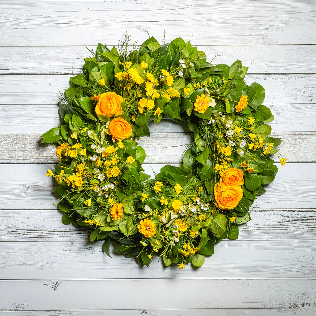Warmth and joy burst from our delightful Sunny Citrus wreath like rays of sunshine to fill any home with cheer! A vibrant and lush foundation of fresh salal and sweet huckleberry is beautifully accented with a delightful mix of faux, artificial orange and yellow ranunculus, white wax flowers, and other mixed yellow flowers. Bright and happy, the contrasting textures will infuse your home with excitement and good cheer. This jubilant 26” wreath gleams with style and flair. It is a perfect way to celebrate warmer days! This all-natural 26” wreath is handmade with salal and sweet huckleberry branches collected locally from the foothills of the Cascade and Olympic Mountains here in Washington state.